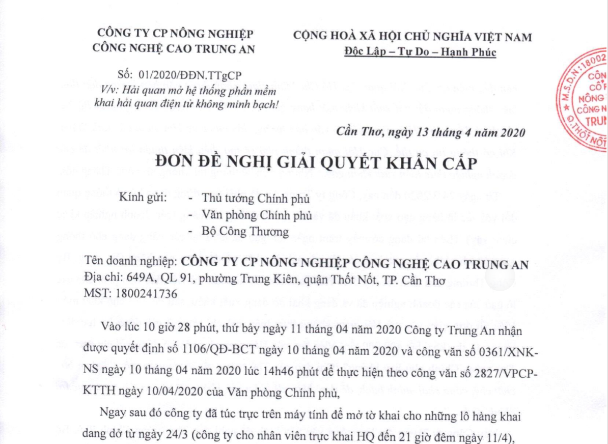 Ảnh chụp Văn bản Đề nghị giải quyết khẩn cấp về việc Hải quan mở hệ thống phầm mềm khai hải quan điện tử không minh bạch của Công ty Trung An. Nguồn: Công ty Trung An.
