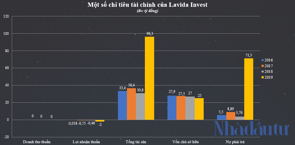 Dữ liệu của Nhadautu.vn thể hiện, trong giai đoạn 2016-2019, Lavida Invest (công ty mẹ) không phát sinh doanh thu thuần và liên tục báo lỗ, riêng năm 2019 lỗ hơn 2 tỷ đồng. Tại ngày 31/12/2019, tổng tài sản của doanh nghiệp này là 96,3 tỷ đồng, trong khi nợ phải trả là 71,3 tỷ đồng.