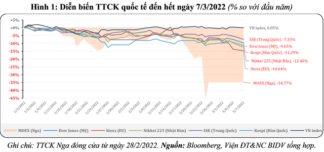 Thị trường chứng khoán (TTCK) của Nga (MOEX) ngay khi mở cửa ngày 24/2 đã giảm 41,7%, xuống mức 1.690 điểm, mặc dù sau đó có sự hồi phục nhẹ. Tính đến phiên giao dịch gần nhất (hết ngày 28/02 khi TTCK Nga bắt đầu ngừng giao dịch từ đó đến nay), thị trường chứng khoán Nga có sự hồi phục và đóng cửa ở mức 2.470 (giảm 34,77% so với đầu năm). Trong khi đó, các TTCK quốc tế cũng sụt giảm đáng kể từ khi xung đột xảy ra. Tại Mỹ, chỉ số Dow Jones (DJI) ngày 24/2/2022 cũng giảm 900 điểm (0,6% so với ngày hôm trước) và tiếp tục xu hướng giảm (đến ngày 7/3/2022 giảm 9,7% so với đầu năm). Tại châu Âu, chỉ số Stoxx 600 giảm 3,28% trong ngày 24/2 và đến ngày 7/3/0022 giảm 14,6% so với đầu năm). Các TTCK châu Á (như Nikkei 225 của Nhật Bản, Shanghai Composite của Trung Quốc và Kospi - Hàn Quốc,…) cũng có những diễn biến tương tự châu Âu và Mỹ (Hình 1).