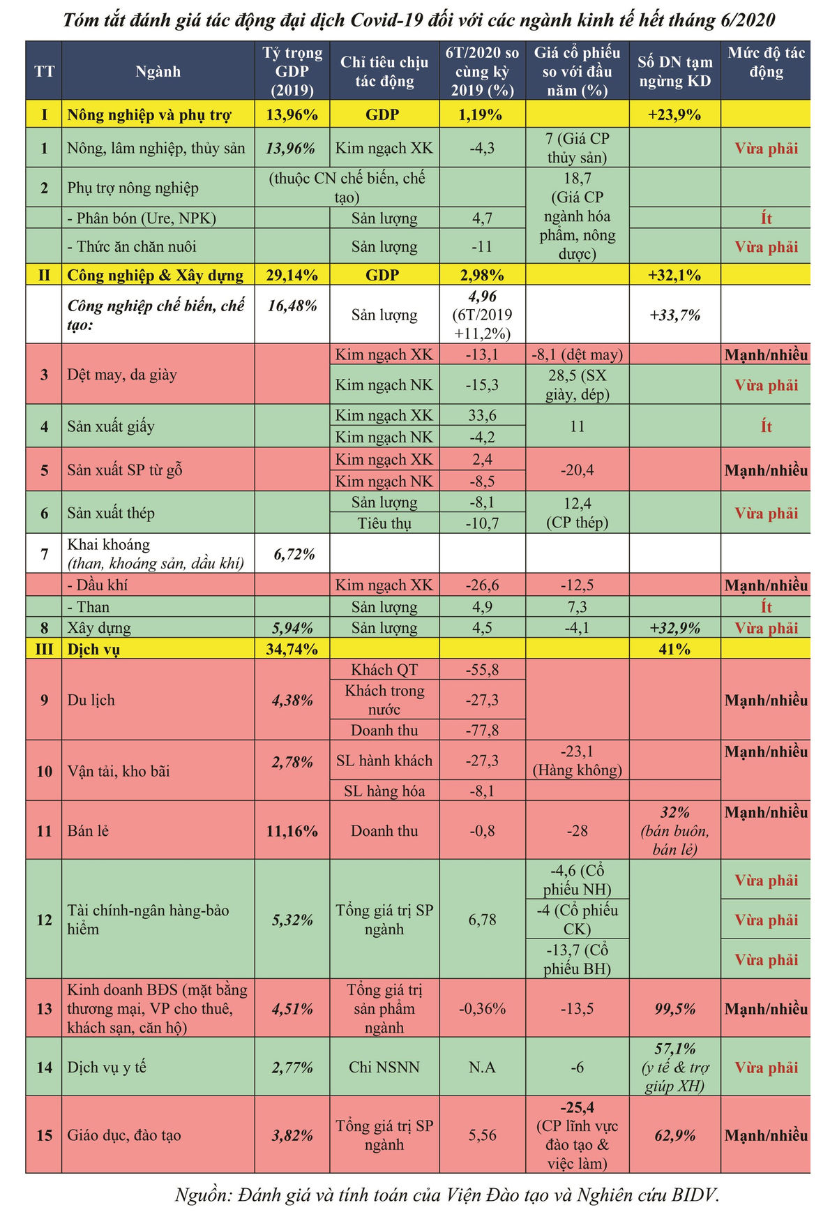 Ngày 10/4/2020, Viện Đào tạo và Nghiên cứu BIDV (ĐT&NC BIDV) đã phát hành Báo cáo “Đại dịch COVID-19 tác động mạnh đến ngành kinh tế nào của Việt Nam?”, trong đó đánh giá tác động của đại dịch đối với 15 ngành kinh tế quan trọng (chiếm 78% GDP) của Việt Nam.