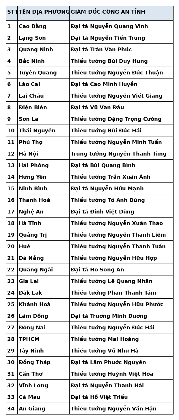 Danh sách 34 giám đốc công an các địa phương sau sáp nhập như sau:
