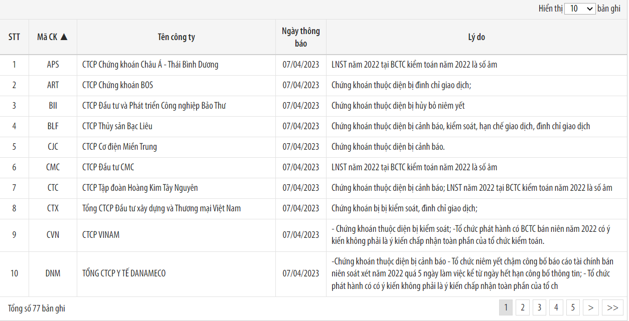 Trong danh sách cập nhật đầu quý 2/2023, HNX đưa ra 77 mã chứng niêm yết trên sàn không đáp ứng đủ điều kiện giao dịch ký quỹ với nhiều lý do khác nhau như chứng khoán thuộc diện bị đình chỉ giao dịch, bị hủy bỏ niêm yết, bị cảnh báo hay lợi nhuận sau thuế năm 2022 trên báo cáo tài chính kiểm toán năm báo số âm…