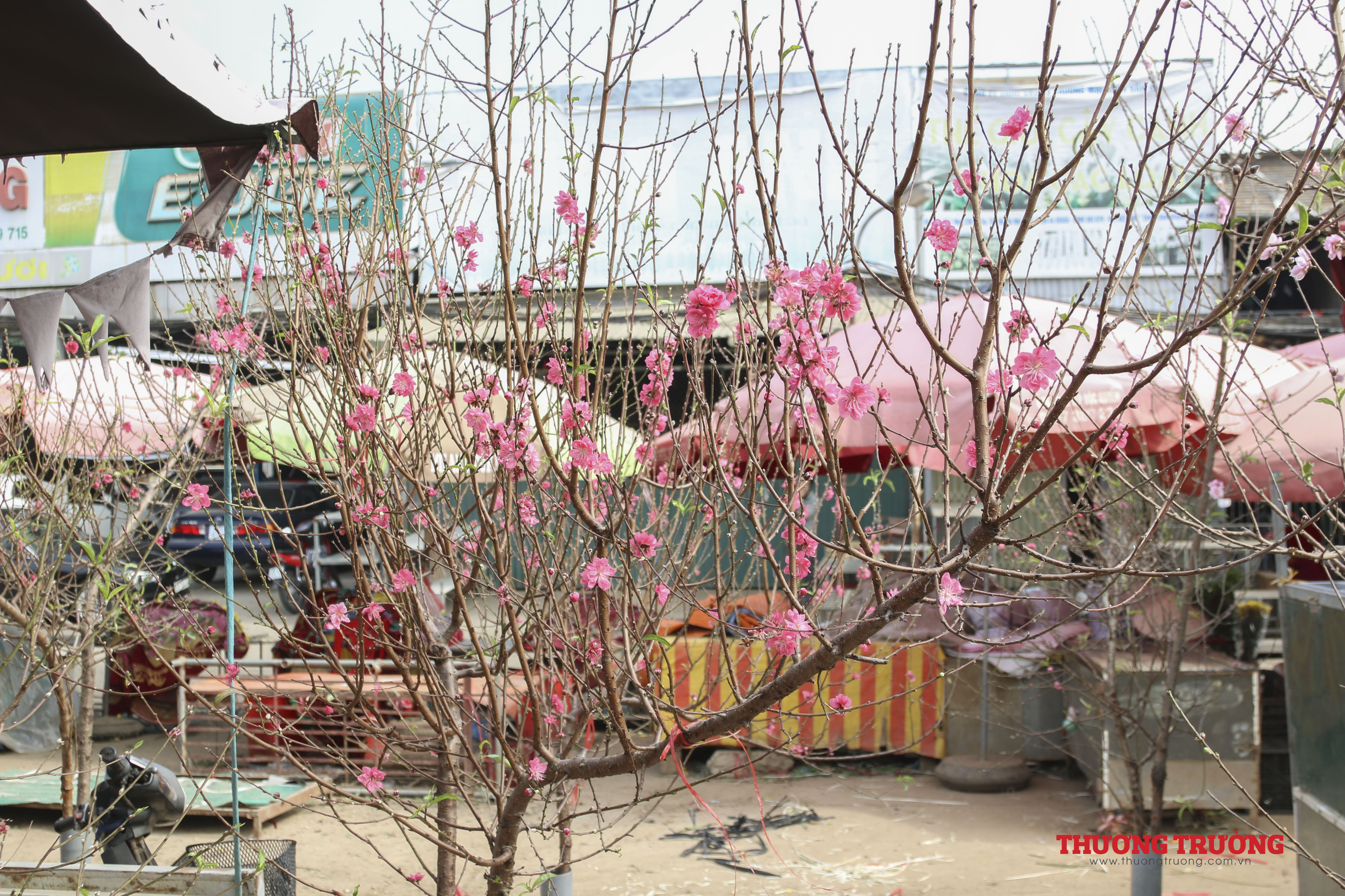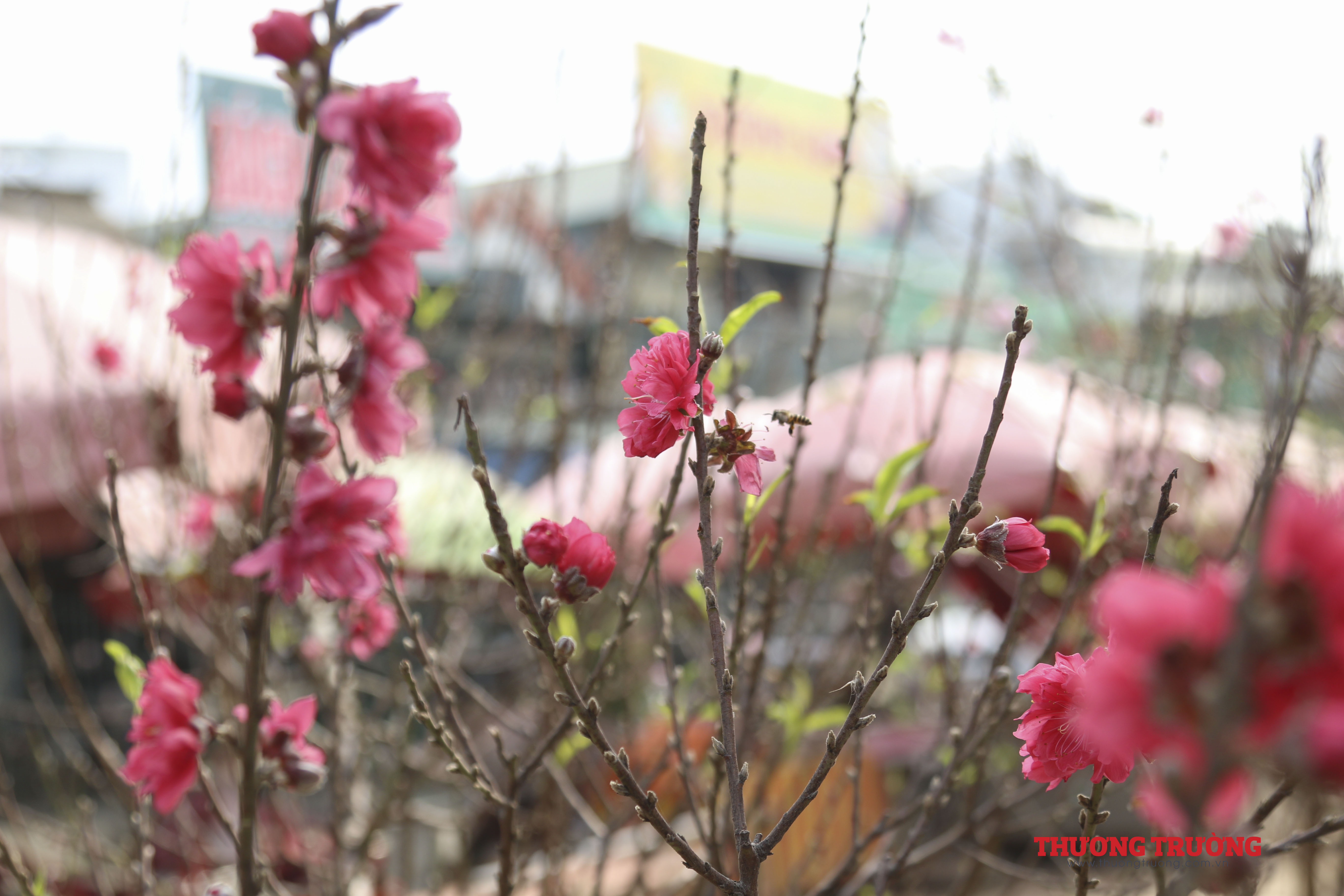 Hàng trăm cành đào Nhật Tân nở sớm đã được bày bán ở chợ Quảng Bá (Hà Nội), khiến phố phường rực rỡ sắc xuân.