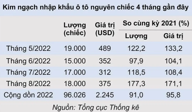 Theo báo cáo sơ bộ của Tổng cục Thống kê, đã có khoảng 18.000 xe ô tô nguyên chiếc (CBU) được nhập khẩu về nước trong tháng 8/2022, giá trị kim ngạch ước đạt 375 triệu USD.