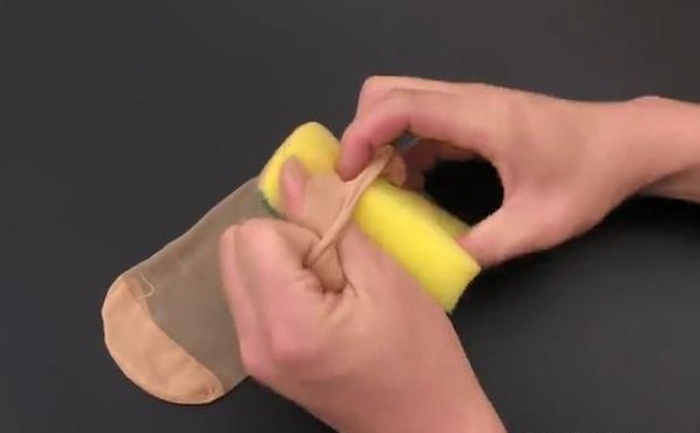 Bước 1: Chuẩn bị một miếng bọt rửa bát và một chiếc tất, cũng có thể sử dụng một chiếc tất cũ.