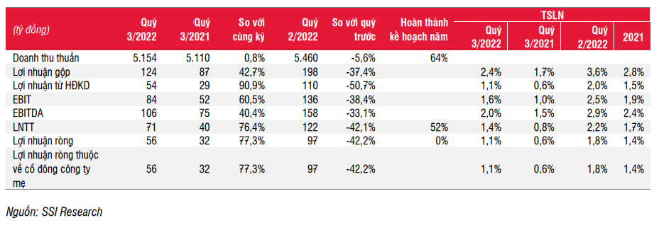 Kết quả kinh doanh quý 3/2022 của VTP. Nguồn SSI Research