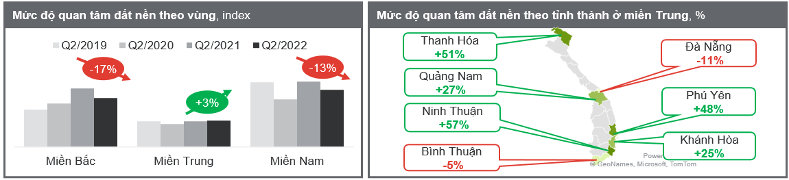 Điểm đáng chú ý là thị trường đất nền có sự phân hóa rõ về khu vực. Trong khi miền Bắc, miền Nam giảm dần sức nóng thì đất nền tại miền Trung vẫn tiếp tục được quan tâm tìm kiếm. Nhiều tỉnh thành như Khánh Hòa, Ninh Thuận, Thanh Hóa, Phú Yên, Quảng Nam... đều ghi nhận lượt tìm kiếm tăng từ 25% đến 57% so với trước dịch. Điểm chung của các thị trường này đều là các tỉnh ven biển, những nơi phát triển mạnh bất động sản du lịch - nghỉ dưỡng, loại hình đang phục hồi mạnh mẽ sau dịch.