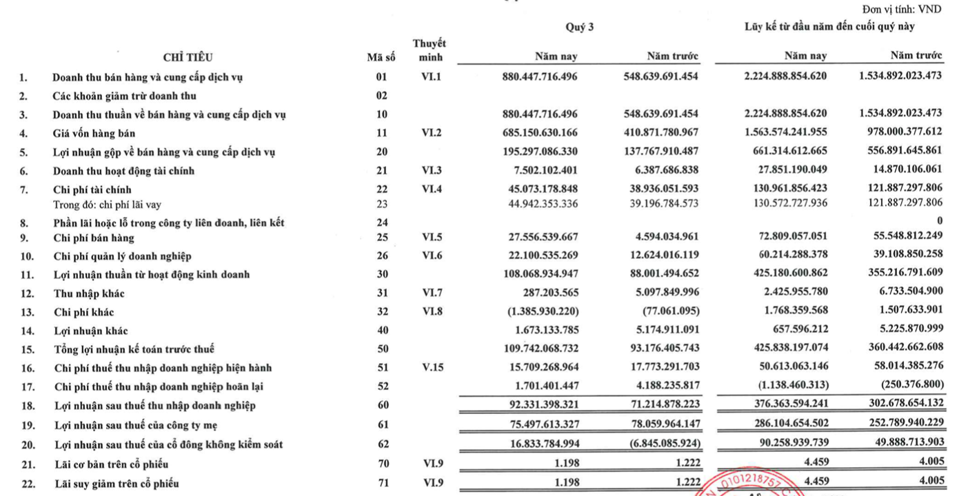 Lũy kế 9 tháng, doanh thu thuần của Đạt Phương đạt gần 2.225 tỷ đồng, tăng 45% so với cùng kỳ năm trước. Doanh thu tài chính tăng gấp đôi, đạt 28 tỷ đồng. Dù các loại chi phí tăng đáng kể, Đạt Phương báo lãi 376 tỷ đồng, tăng 24% so với cùng kỳ.