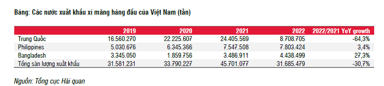 Trong quý 4.2022, SSI nhận thấy dấu hiệu phục hồi của xuất khẩu xi măng khi xuất khẩu xi măng tăng 32% so với quý trước. Tuy nhiên, kênh này có thể bị ảnh hưởng do việc tăng thuế xuất khẩu clinker từ 5% lên 10% từ ngày 1/1/2023 nhằm hạn chế xuất khẩu khoáng sản, theo Nghị định số 101/2021/NĐ-CP mới đây.