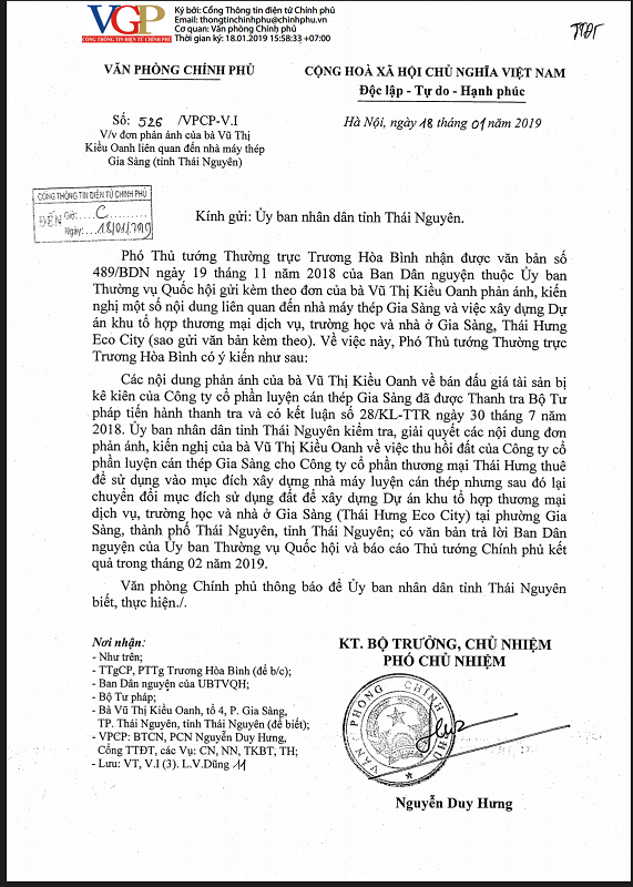 Ở một diễn biến khác, ngày 18/1/2019, ông Nguyễn Duy Hưng – Phó Chủ nhiệm Văn phòng Chính phủ đã ký văn bản số 526/VPCP-V.I gửi UBND tỉnh Thái Nguyên. Nội dung công văn nêu rõ: Phó Thủ tướng Thường trực Trương Hòa Bình nhận được văn bản số 489/BDN ngày 19/11/2018 của Ban Dân nguyện thuộc Ủy ban Thường vụ Quốc hội gửi kèm theo đơn của bà Vũ Thị Kiều Oanh phản ánh, kiến nghị một số nội dung liên quan đến nhà máy thép Gia Sàng về việc xây dựng Dự án khu tổ hợp thương mại dịch vụ, trường học và nhà ở Gia Sàng, Thái Hưng Eco City. Về việc này, Phó Thủ tướng Thường trực Trương Hòa Bình có ý kiến như sau: