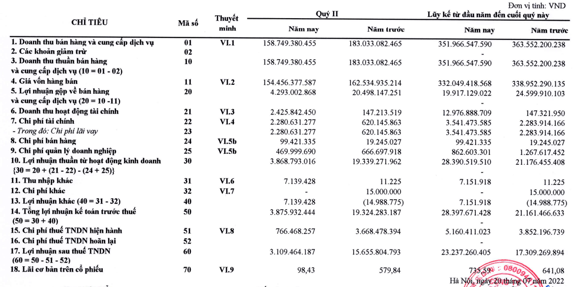 Tính lũy kế cả 6 tháng đầu năm 2022, doanh thu thuần của Công ty ghi nhận 351 tỷ đồng, giảm nhẹ 4% so với cùng kỳ năm trước. Tuy nhiên, chi phí giá vốn không giảm cùng tốc độ của doanh thu nên lợi nhuận gộp giảm đến 19% chỉ còn 19,9 tỷ đồng.