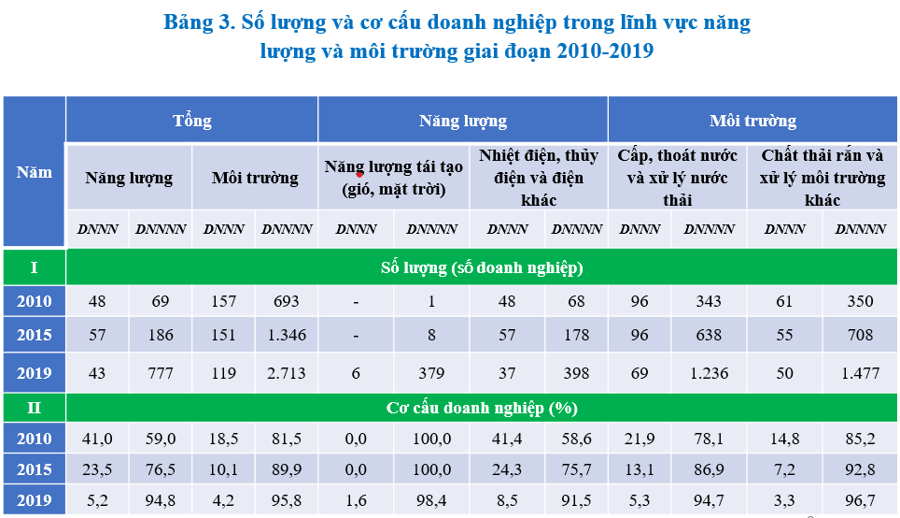 Thông tin từ CIEM cho biết, giai đoạn 2010-2019, số lượng doanh nghiệp tư nhân tham gia đầu tư vào lĩnh vực năng lượng và môi trường tăng mạnh, đặc biệt là đầu tư vào sản xuất năng lượng tái tạo, nước sạch, dịch vụ thu gom và xử lý nước thải, chất thải rắn.