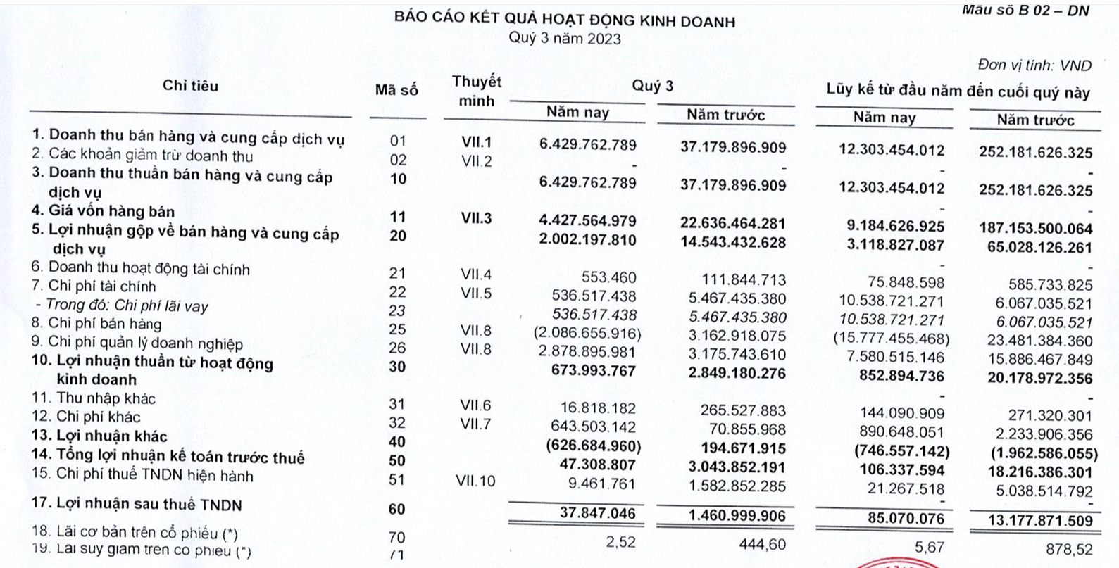 Trong kỳ, chi phí tài chính giảm về còn 536 triệu đồng, công ty cũng hoàn nhập một số cho phí bán hàng đã kết thúc chu kỳ bán hàng không sử dụng. Chi phí quản lý doanh nghiệp cũng giảm 9% xuống còn gần 3 tỷ đồng. Tuy nhiên, lợi nhuận sau thuế quý 3 vẫn giảm tới 97,4% chỉ còn 37,8 triệu đồng.