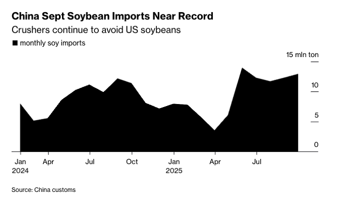 Theo số liệu từ Tổng cục Hải quan Trung Quốc, lượng đậu tương nhập khẩu trong tháng 9 đạt 12,9 triệu tấn, mức cao nhất từng ghi nhận cho tháng này và gần chạm kỷ lục mọi thời đại hồi tháng 5.