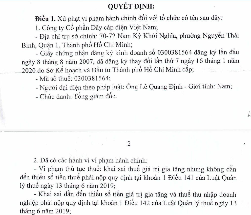 Với hành vi nêu trên, Dây cáp điện Việt Nam bị phạt tiền gần 240 triệu đồng, trong đó phạt về hành vi vi phạm thủ tục thuế 6,5 triệu đồng; Phạt về hành vi khai sai dẫn đến thiếu số tiền thuế GTGT phải nộp (theo tỷ lệ 20% trên số thuế truy thu) gần 154 triệu đồng. Phạt hành vi khai sai dẫn đến thiếu số thuế TNDN phải nộp (theo tỷ lệ 20% trên số thuế truy thu) 79,2 triệu đồng.