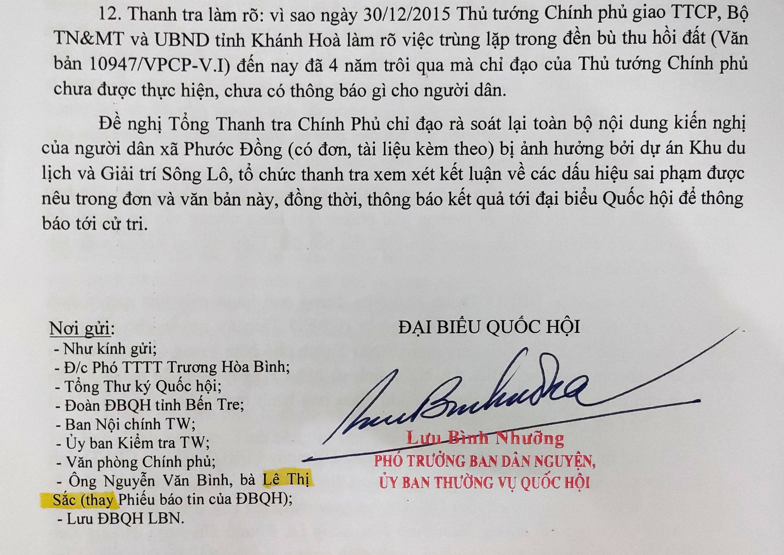 Đại biểu quốc hội Lưu Bình Nhưỡng, Phó trưởng ban Dân nguyện của Quốc hội có văn bản đề nghị Tổng Thanh tra Chính phủ làm rõ những kiến nghị của người dân liên quan việc thu hồi đất tại dự án Sông Lô nay là tổ hợp du lịch Diamond Bay Nha Trang - Khánh Hòa.