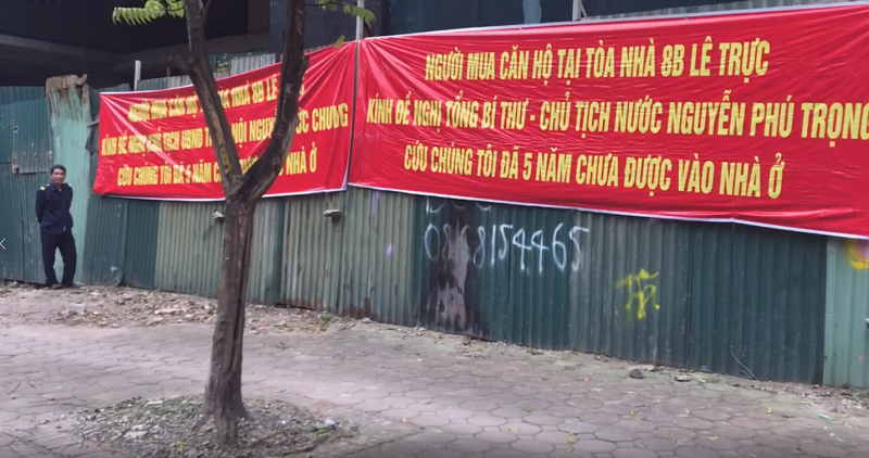 Bức xúc trước việc để công trình đứng như “tội đồ”, nhiều năm qua, những người mua nhà tại dự án 8B Lê Trực đã nhiều lần căng băng rôn, biểu ngữ “đòi nhà” nhưng vẫn không có ngành chức năng nào đứng ra xử lý.