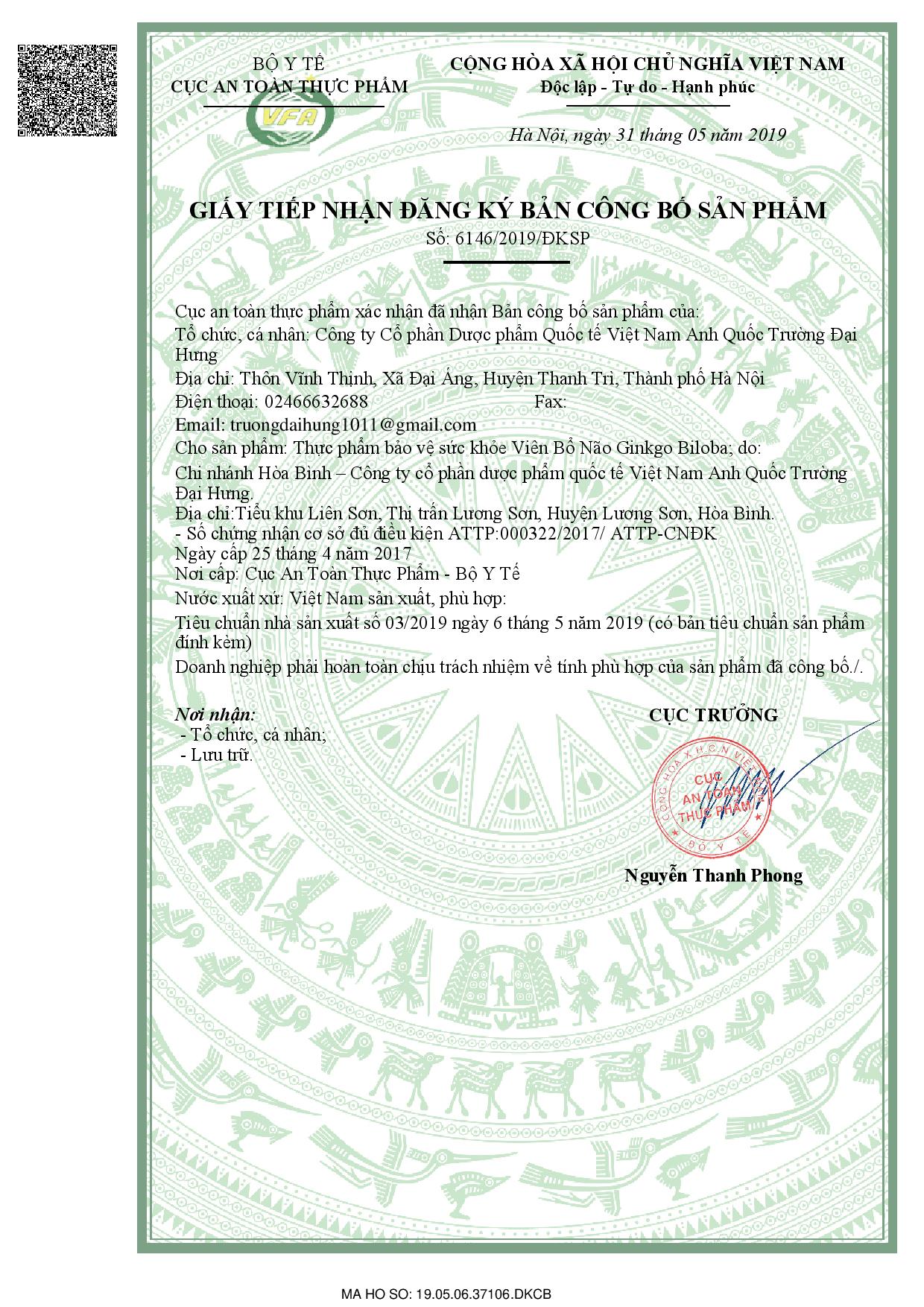Được biết, sản phẩm này do Công ty Cổ phần Dược phẩm Quốc tế Việt Nam Anh Quốc Trường Đại Hưng tự công bố, số công bố 9/2019/0107603191-DKCB. Đến ngày 31/05/2019, Cục An toàn thực phẩm cấp Giấy tiếp nhận đăng ký bản công bố sản phẩm số 6146/2019/ĐKSP.