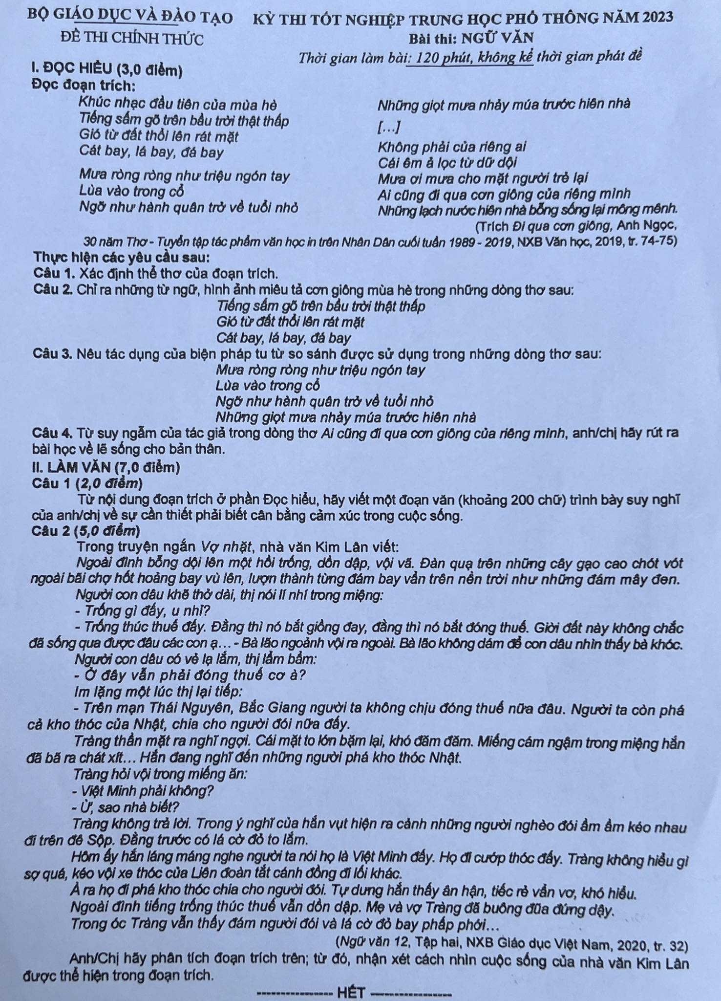 Cuối cùng, xin được dẫn lời của cụ Sóng Hồng (nguyên Tổng Bí thư Trường Chinh) rằng: “Văn học là thể hiện con người và thời đại một cách tốt đẹp”. Cho nên, chưa thể tìm thấy thời đại hôm nay thực sự trong đề thi môn văn ở kỳ thi tốt nghiệp THPT năm 2023 này.