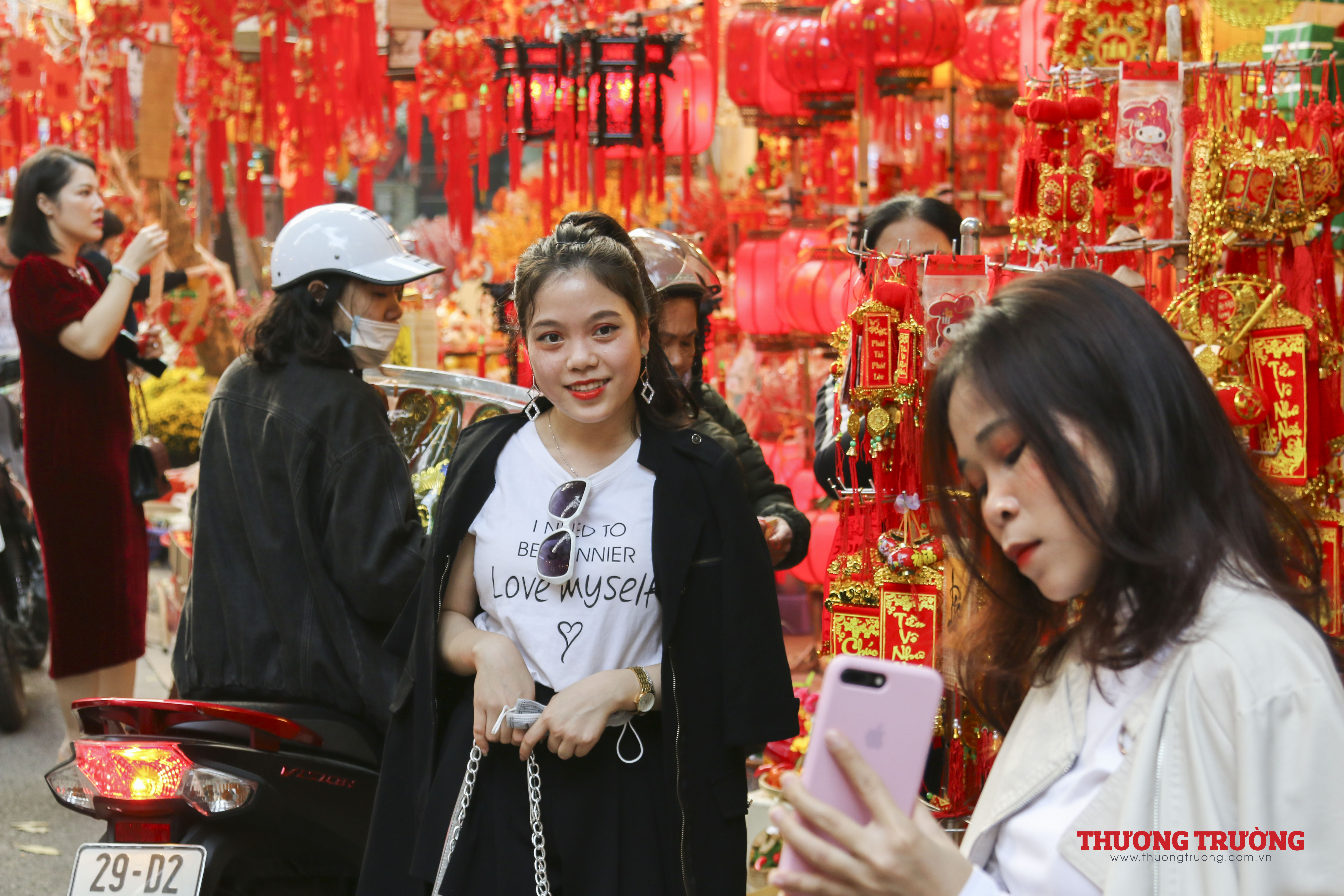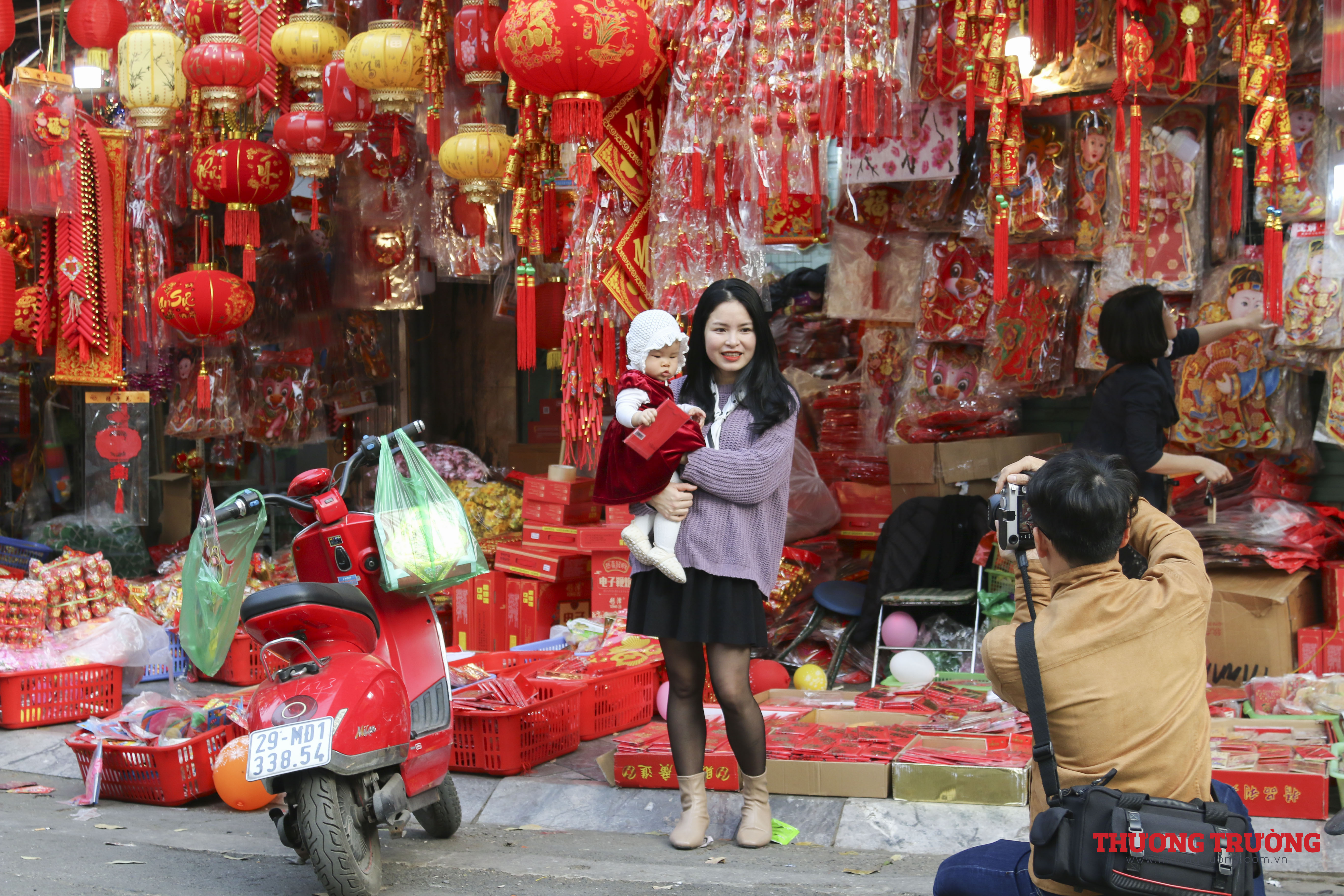 Nhiều người dân tranh thủ tận dụng không gian được bày trí tại Hàng Mã để có thể chụp những khoảnh khắc cận Tết.