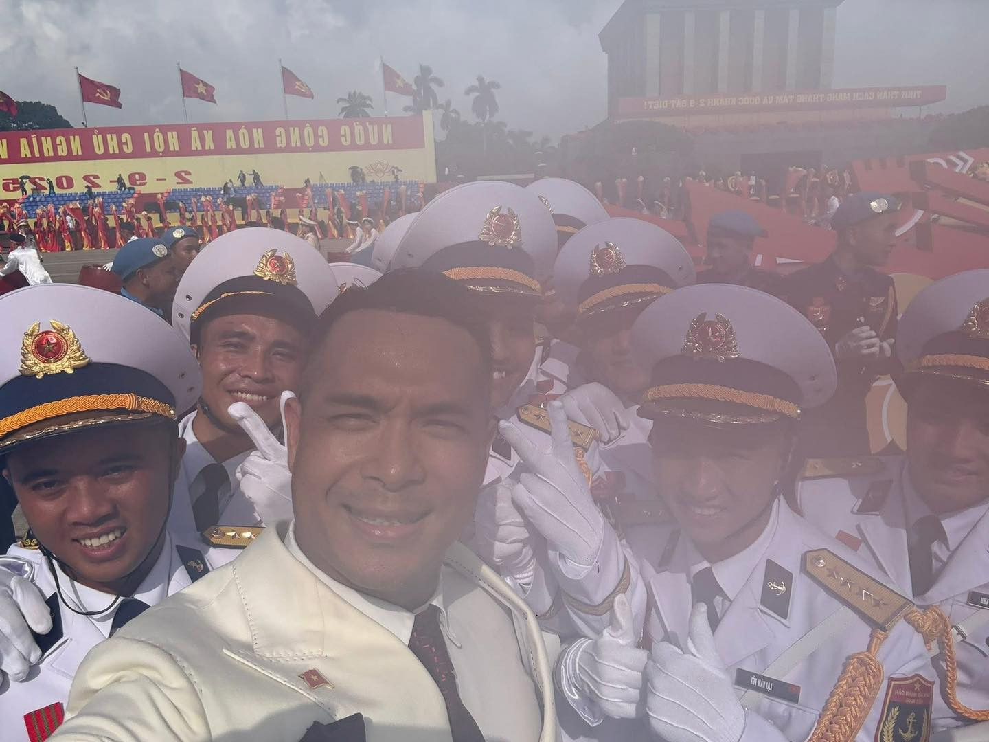 Theo đó, vì thời tiết ngày diễu binh nắng khá gắt nên loạt ảnh selfie kỉ niệm sự kiện A80 của Trương Thế Vinh bị hắt sáng, không nhìn rõ mặt nhiều người. Trong hình, mặt của chính chủ đến các chiến sĩ đều đen thui khiến người xem "cười ngất".