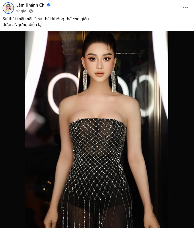 Đáng chú ý, mới đây, Lâm Khánh Chi cập nhật dòng trạng thái mới sau đám tang cố nghệ sĩ gây chú ý. Trên trang cá nhân, cô đăng ảnh và viết: "Sự thật mãi mãi là sự thật không thể che giấu được. Ngưng diễn lại."