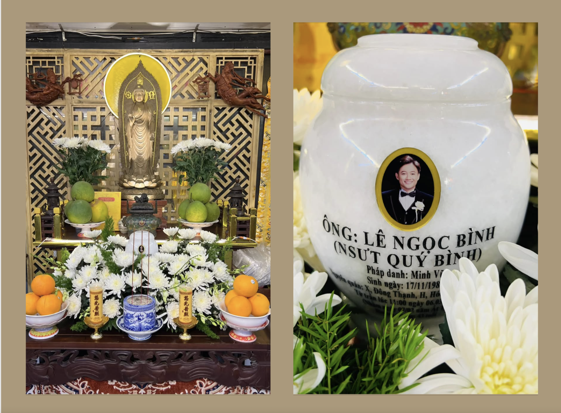 Theo đó, tro cốt của diễn viên Quý Bình sẽ được đặt tại chùa Đức Quang (quận 4, TP HCM). "Cho anh được nghe kinh, sau 49 ngày sẽ rải hết xuống biển Cần Giờ. Ai rảnh ghé viếng anh Bình nhe", Lâm Khánh Chi thông báo trên trang cá nhân.