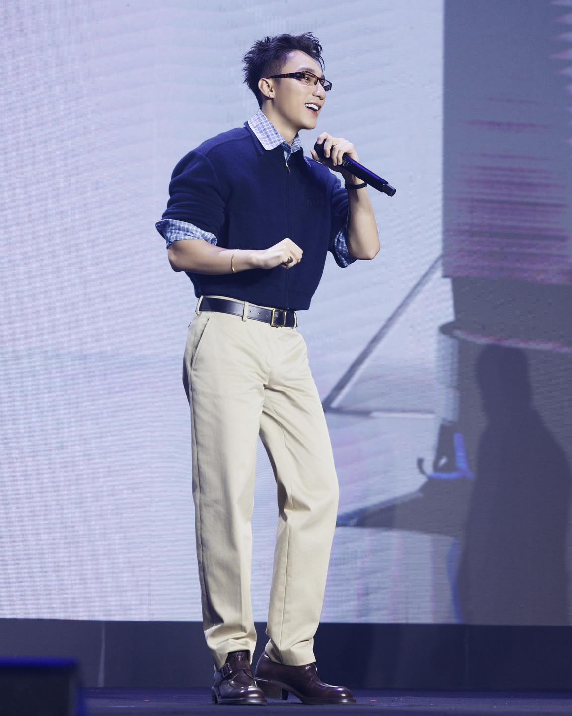 Theo đó, Sơn Tùng diện áo jacket màu xanh phối sơ mi kẻ, sơ vin với quần be sáng, kết hợp phụ kiện là thắt lưng và giày da.