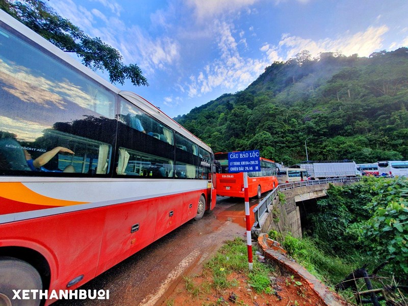 Do đèo Bảo Lộc sát lở nghiêm trọng nên ô tô bị kẹt nối dài dọc đèo và dưới chân đèo dài cả chục km.