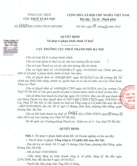 Tổng CTCP Dệt may Hà Nội (Hanosimex, UPCoM: HSM) vừa công bố nhận được quyết định xử lý vi phạm thuế của Cục Thuế Thành phố Hà Nội.