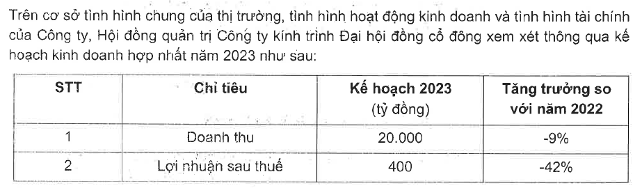 Về phần phân phối lợi nhuận, Công ty dự kiến chi cổ tức năm 2022 bằng tiền mặt với tỷ lệ 10%, tương ứng 1.000 đồng/cp. Kế hoạch phân phối lợi nhuận năm 2023, Hội đồng quản trị công ty sẽ căn cứ vào tình hình kinh doanh thực tế trong năm và xây dựng phương án trình ĐHĐCĐ tại kỳ đại hội gần nhất.