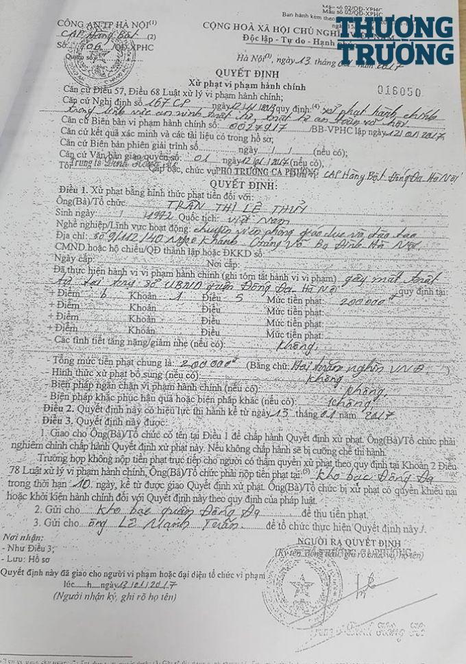Nội dung đơn khởi kiện viết: “Ngày 17/2/2017, tôi (bà Thủy) nhận được Quyết định xử phạt hành chính số 06/QĐ-XPHC do Trung tá Đinh Hồng Hà, Phó Trưởng Công an phường Hàng Bột ký ngày 13/1/2017 với nội dung: “Hồi 16 giờ, ngày 16/1/2017, tôi (Trần Thị Lệ Thủy) đã có hành vi gây mất trật tự tại trụ sở UBND quận Đống Đa (Hà Nội) vi phạm vào điểm b, khoản 1, Điều 5, Nghị định 167/CP”.