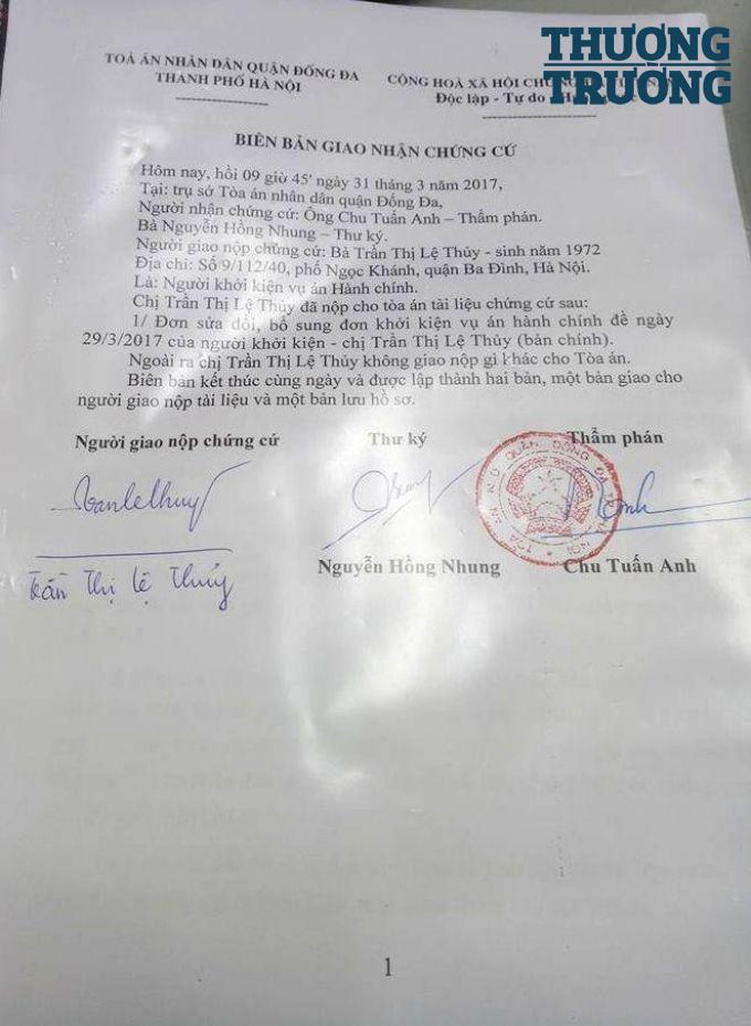Ngày 31/3/2017, Tòa án nhân dân quận Đống Đa (Hà Nội) đã lập Biên bản giao nhận chứng cứ với nội dung: “Chị Trần Thị Lệ Thủy đã nộp cho Tòa án tài liệu chứng cứ sau: “Đơn sửa đổi, bổ sung đơn khởi kiện vụ án hành chính đề ngày 29/3/2017 của người khởi kiện (bản chính)”. Người ký biên bản có Thẩm phán Chu Tuấn Anh.