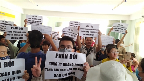 Khi lên văn phòng Địa ốc Hoàng Quân thì nhân viên công ty thông báo rằng chúng tôi phải đóng thêm 45% giá trị căn hộ, còn 5% còn lại sẽ đóng vào thời điểm 5 năm sau khi bàn giao sổ đỏ. Nếu không đóng thêm 45% giá trị căn hộ (tức đóng tổng cộng 95% giá trị căn hộ xã hội cho thuê) thì sẽ không bàn giao nhà”.