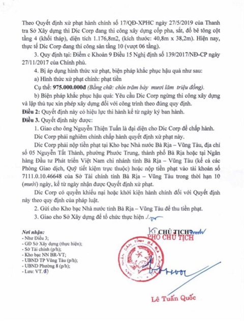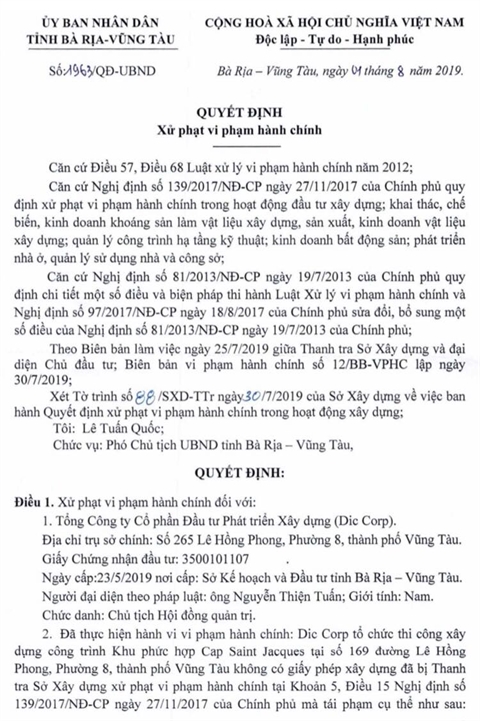 Ngày 2/8, UBND tỉnh Bà Rịa - Vũng Tàu đã ra quyết định xử hành chính đối với Tổng công ty Cổ phần Đầu tư phát triển xây dựng (DIC Corp, có địa chỉ số 265 Lê Hồng Phong, Phường 8, TP Vũng Tàu) vì hành vi xây dựng công trình không phép.
