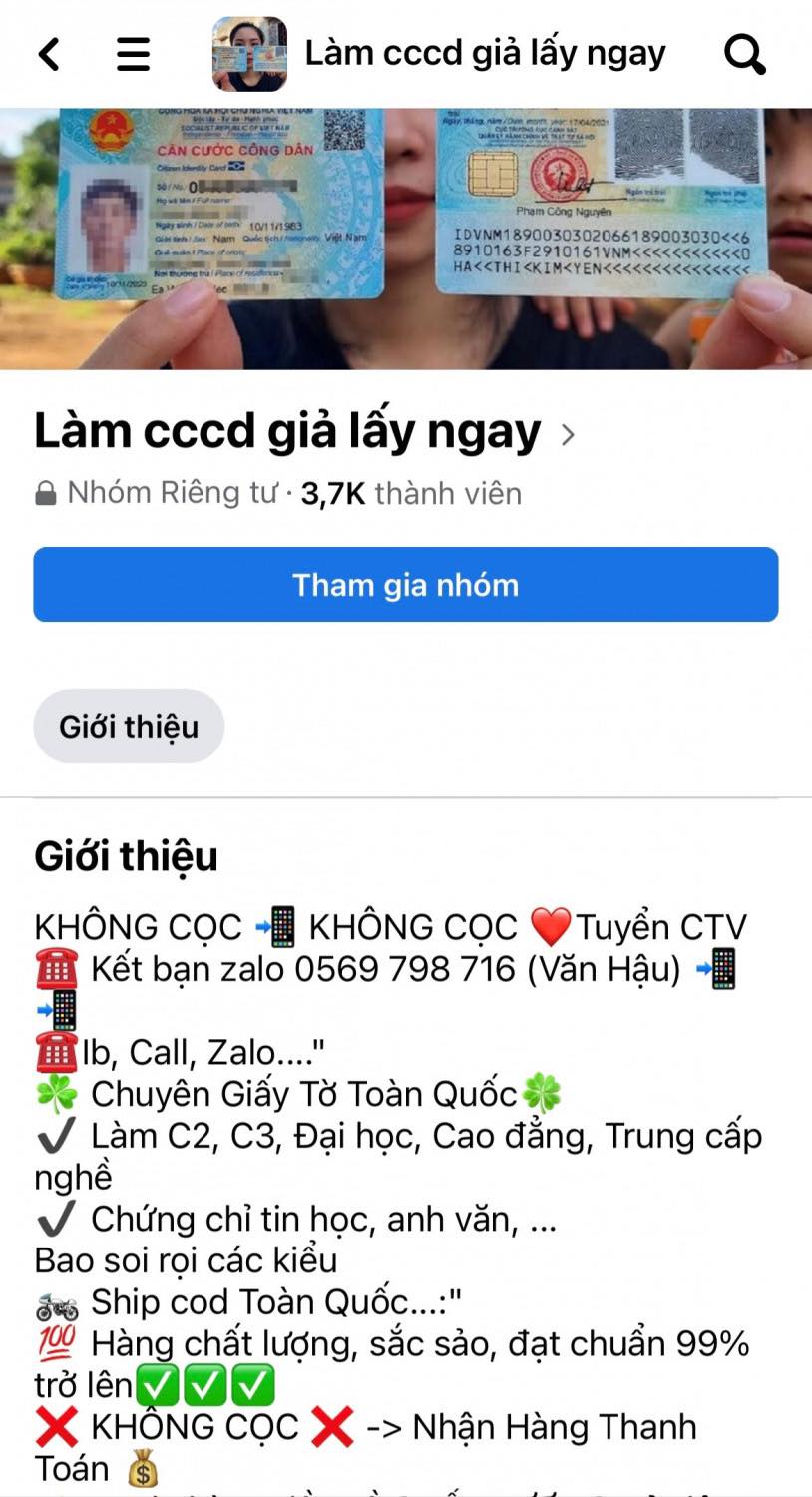 Cụ thể, ngày 06/9, Công an tỉnh Đồng Tháp đưa ra cảnh báo thủ đoạn “nhận làm thẻ CCCD giả” trên mạng xã hội. Động thái này được Công an Đồng Tháp đưa ra khi thời gian qua trên mạng xã hội Facebook, Zalo xuất hiện nhiều hội, nhóm quảng cáo dịch vụ “nhận làm thẻ CCCD giả”, “làm CCCD giả gắn chip phôi chuẩn 2023”,... thu hút hàng chục ngàn người tham gia, tương tác.
