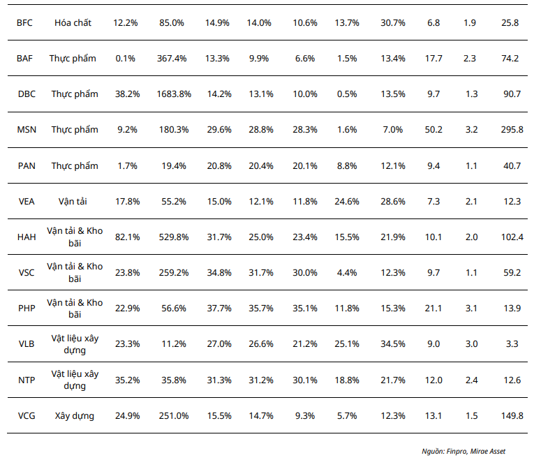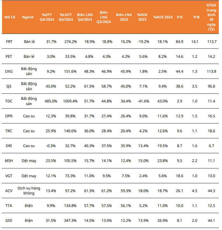 Danh sách các cổ phiếu tiềm năng như FRT, DXG, DPR, ACV, BAF, VGT, DBC, MSN...