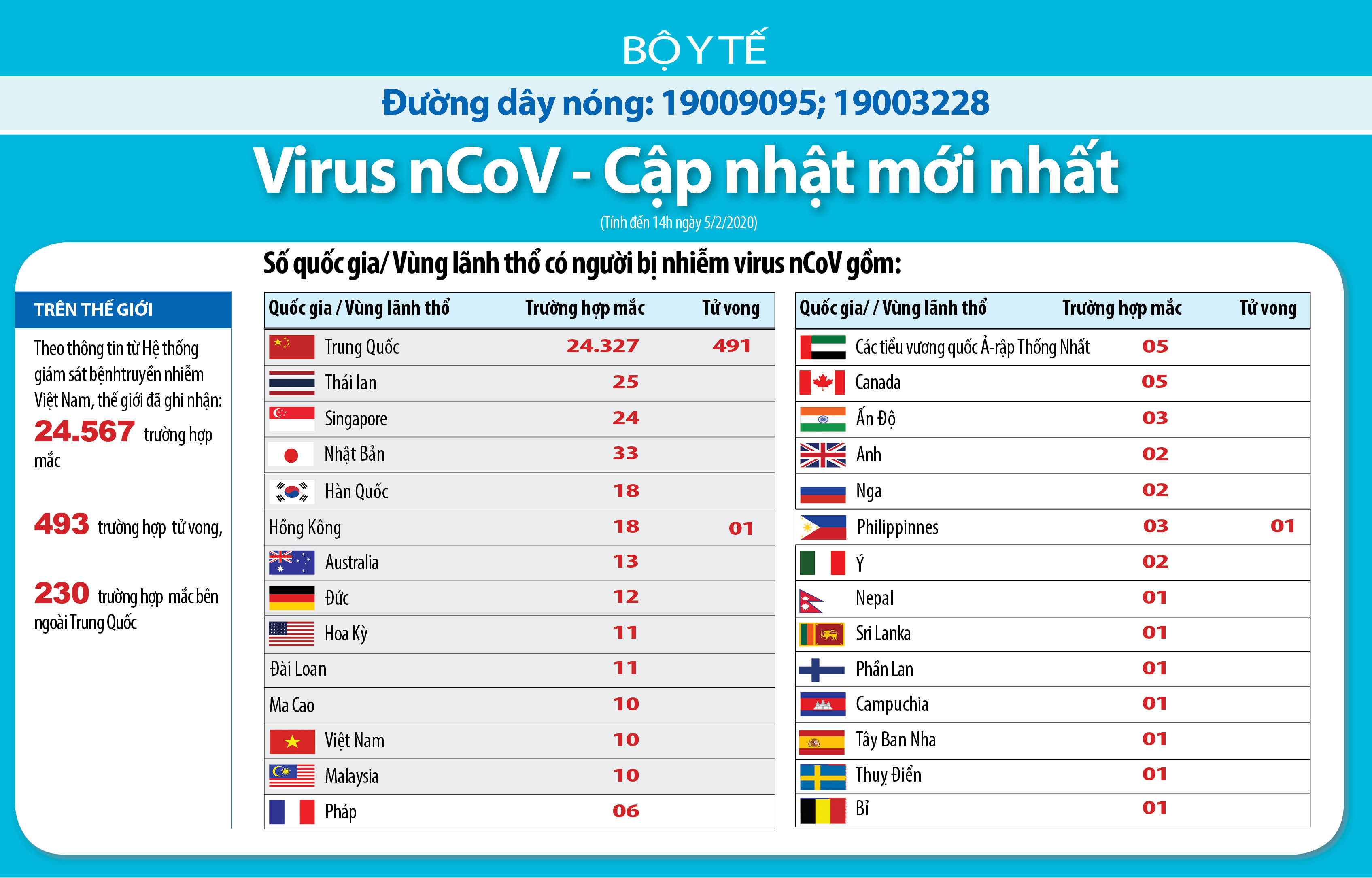 Theo báo cáo của hệ thống giám sát bệnh truyền nhiễm Bộ Y tế, đến 16 giờ 00, ngày 5/2/2020, tình hình dịch bệnh viêm đường hô hấp do chủng mới của virus Corona (nCoV) trên thế giới cụ thể như sau: