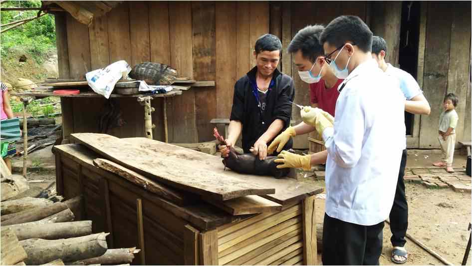 Cán bộ Trạm Thú y huyện Mường Nhé lấy mẫu xét nghiệm lợn tại bản Nậm Là, xã Mường Nhé.