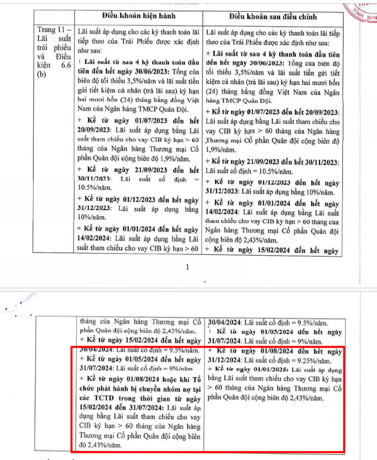 Trong khi đó, theo điều khoản hiện hành, kể từ ngày 1/8/2024 hoặc khi Tổ chức phát hành bị chuyển nhóm nợ tại các tổ chức tín dụng trong thời gian từ ngày 15/2/2024 đến 31/7/2024, lãi suất áp dụng bằng lãi suất tham chiếu cho vay CIB kỳ hạn > 60 tháng của Ngân hàng thương mại cổ phần Quân đội cộng biên độ 2,43%/năm.