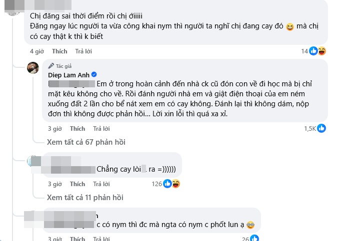Diệp Lâm Anh lập tức đáp trả: "Em ở trong hoàn cảnh đến nhà chồng cũ đón con về đi học mà bị chỉ mặt kêu không cho về. Rồi đánh người nhà em và giật điện thoại của em ném xuống đất 2 lần cho bể nát xem em có cay không. Đánh lại thì không dám, nộp đơn thì không được phản hồi… Lời xin lỗi thì quá xa xỉ."