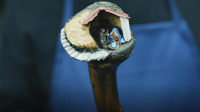 Hình ảnh Chúa giáng sinh được tái hiện lại trên cán cầm của một chiếc ô Talarico.