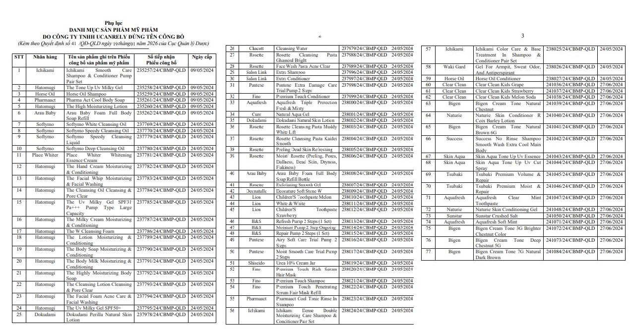 Cục Quản lý Dược (Bộ Y tế) vừa ban hành quyết định đình chỉ lưu hành, thu hồi trên phạm vi toàn quốc và buộc tiêu hủy 77 sản phẩm mỹ phẩm do Công ty TNHH Ucanrely đứng tên công bố. Danh sách vi phạm bao gồm nhiều nhãn hiệu mỹ phẩm quen thuộc trên thị trường như Hatomugi, Tsubaki, Pantene, Rosette, Fino, Ichikami, Bigen, Aquafresh…