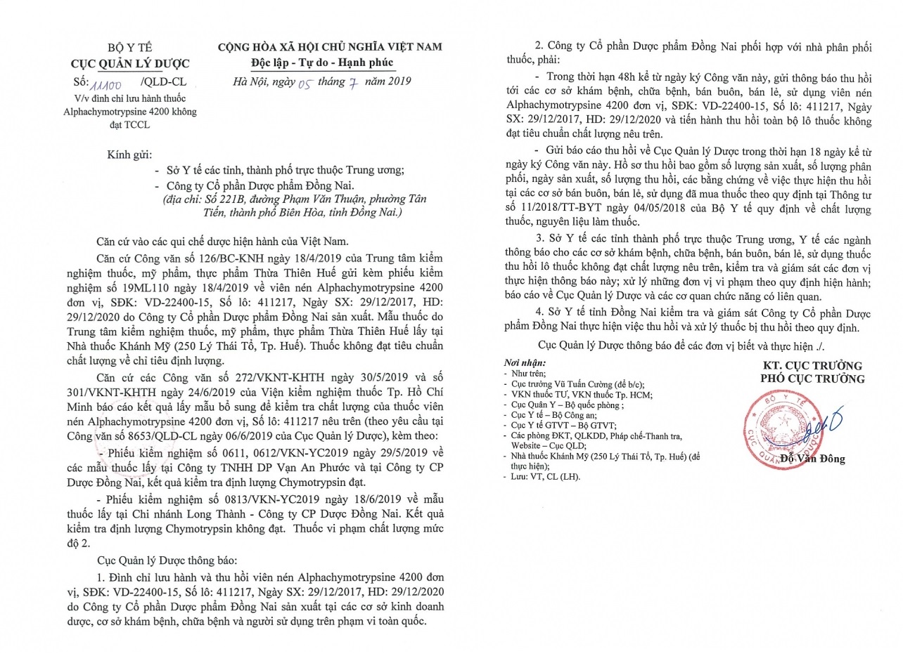 Cục Quản lý dược thông báo, đình chỉ lưu hành và thu hồi viên nén Alphachymotrypsine 4200 trên phạm vi toàn quốc, đồng thời yêu cầu Công ty Cổ phần Dược phẩm Đồng Nai phối hợp với nhà phân phối phải gửi thông báo thu hồi tới các cơ sở khám, chữa bệnh, bán buôn, bán lẻ, sử dụng lô thuốc trên.
