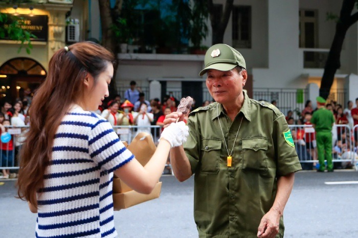 Trong khi hai nàng hậu khác là Tiểu Vy, Lương Thùy Linh góp mặt trong đội ngũ diễu hành thì Đỗ Mỹ Linh lại "lên sóng" theo cách âm thầm hơn. Trong tiết trời oi nóng, hình ảnh Đỗ Mỹ Linh mướt mải mồ hôi, vừa trò chuyện vừa phát kem cho mọi người.