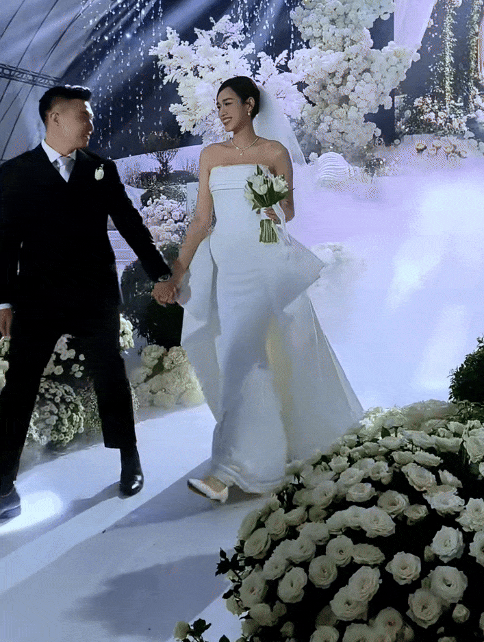 Xuyên suốt đám cưới, chú rể Viết Vương cũng gây chú ý khi liên tục có những hành động quan tâm dành cho Hoa hậu Đỗ Hà. Anh luôn theo sát, chỉnh váy, đỡ tay vợ di chuyển giữa không gian tiệc.