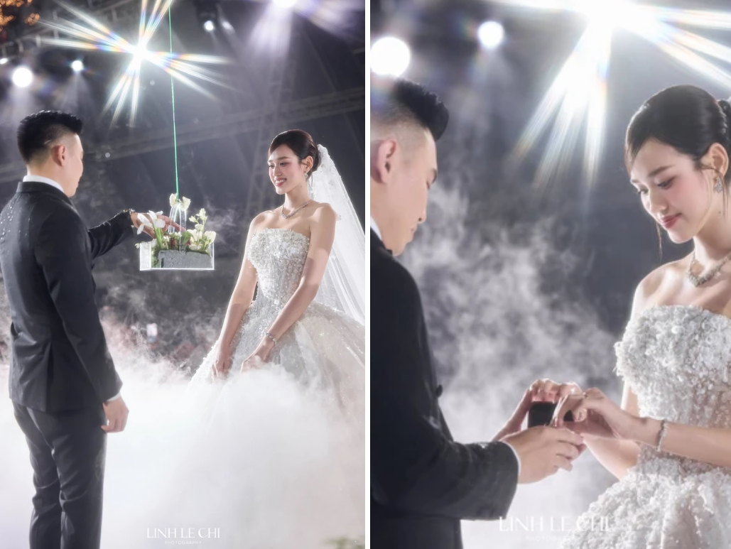 Giữa khung cảnh rạp cưới lung linh bên sông Nhật Lệ, Hoa hậu Đỗ Thị Hà và chú rể Viết Vương đã có khoảnh khắc trao nhẫn cưới vô cùng đặc biệt. Dù thời tiết bất ngờ đổ mưa nhẹ, cả hai vẫn nắm tay nhau bước lên lễ đường, nở nụ cười rạng rỡ giữa tiếng reo hò của khách mời.