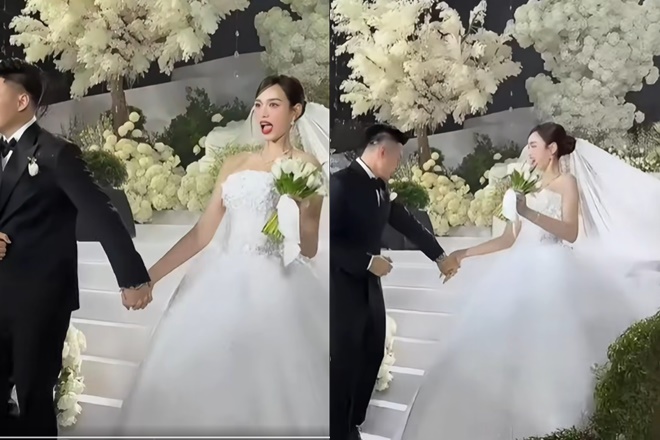 Trong ngày vui, một sự cố nhỏ đã xảy ra. Trên mạng xã hội, dân tình lan truyền đoạn clip ghi lại khoảnh khắc cô dâu Đỗ Thị Hà cùng chú rể nắm chặt tay nhau đi trên lễ đường. Tuy nhiên, phần tà voan dài thượt bất ngờ bị vướng lại phía sau khiến Đỗ Thị Hà hoảng hốt khựng lại.