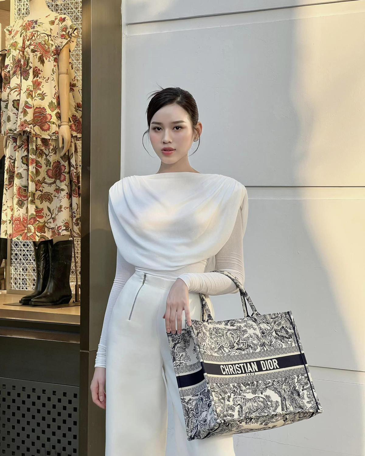 Túi Dior Book Tote với khoang chứa đồ rộng rãi, họa tiết Toile De Jouy đặc trưng của hãng được Đỗ Thị Hà phối với trang phục đi làm, tạo hình ảnh "doanh nhân thành đạt". Túi có giá bán 86 triệu đồng.