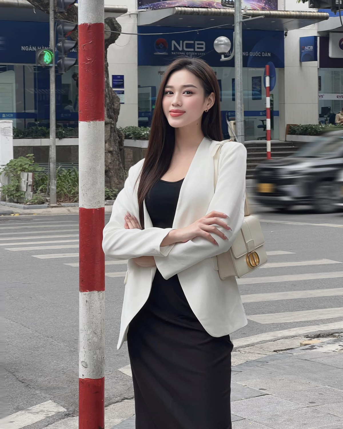 Đỗ Thị Hà theo đuổi phong cách tổng tài khi khoác trên người mẫu quần tây đen, áo sơ mi trắng đóng thùng chỉnh tề. Cô kết hợp thêm chiếc túi hiệu màu trắng trị giá hơn 90 triệu đồng.